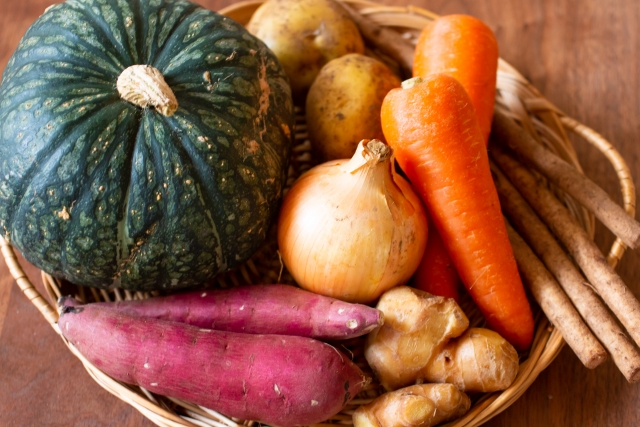 人参やゴボウなどの根菜類やカボチャ、生姜、ネギなど身体を温める食材を献立に多く取り入れ、温かい紅茶や白湯、ココア、ほうじ茶などの飲み物で身体を温めましょう。